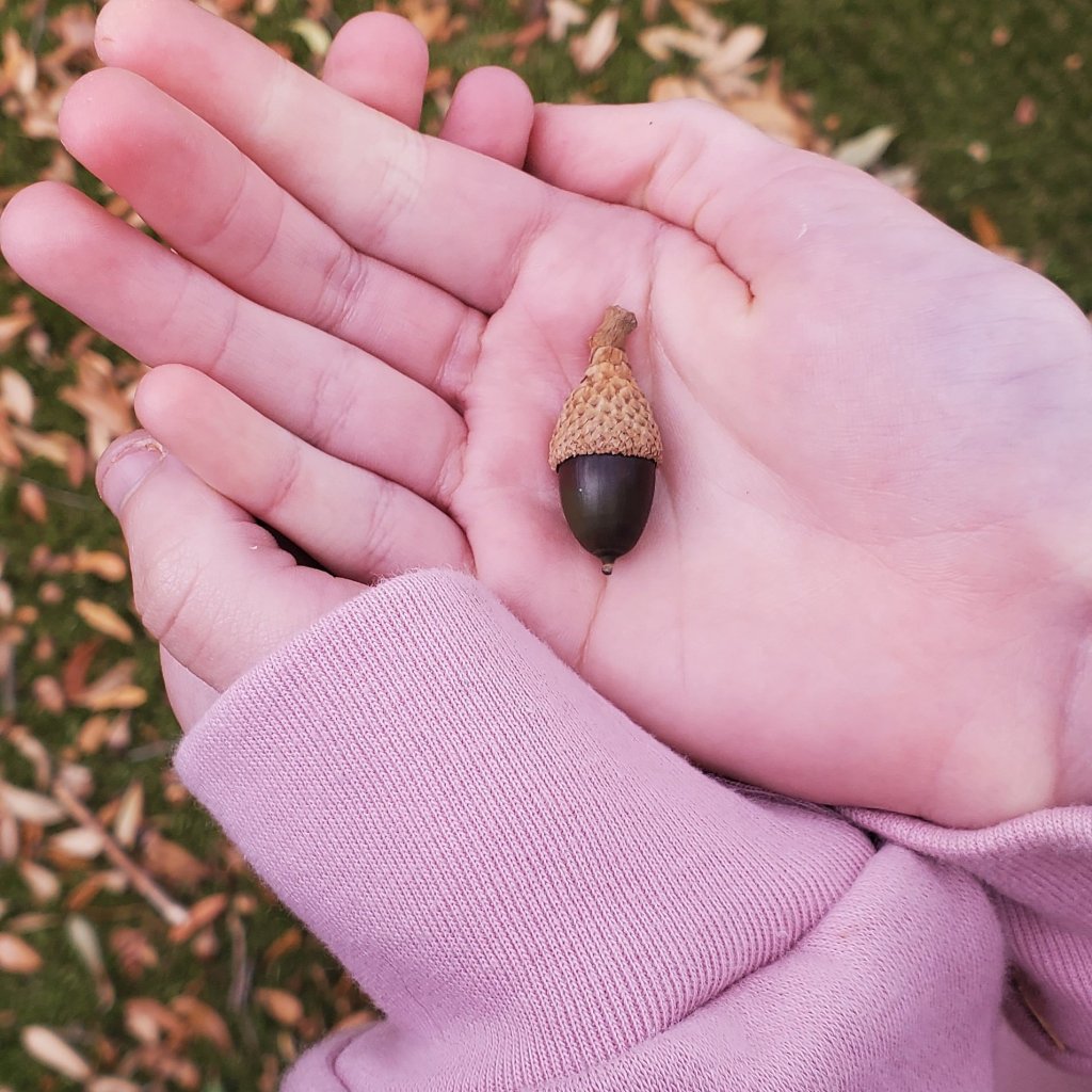 As the ground was littered with “oak tree seeds” as we called them, all she wanted to do was squish them with her boots because she liked the sound so much.