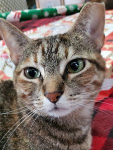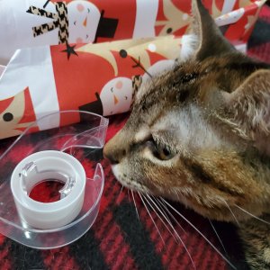 This is my mom’s cat Itsy. And her twin, Bitsy, has been quite helpful as well. And, yes, this is her at the end of the bed underneath the wrapping paper being in full helpful-holiday mode. 🤦‍♀️🥰 Don’t mind me, Itsy.