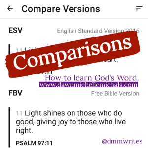 So, when I don’t understand what God is telling me through His word, I compare the versions. YouVersion Bible app makes this super easy for me. I simply tap the scripture, then hit “Compare,” and voila! And, if you hit the 3 horizontal bars in the upper right corner, you can add more versions to choose from and read through.